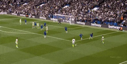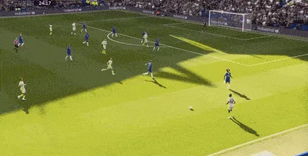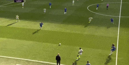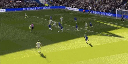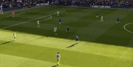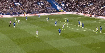 这种情况下,帕尔默和若昂-佩德罗又不能直接从中路打出进攻,也就不能吸引防守重心,从而给边路制造出更大的空间,所以在上半场后半段,切尔西的威胁进攻就变得很少了,这次帕尔默在中路实际失误,但错进错出形成的传中,就是为数不多的机会了: