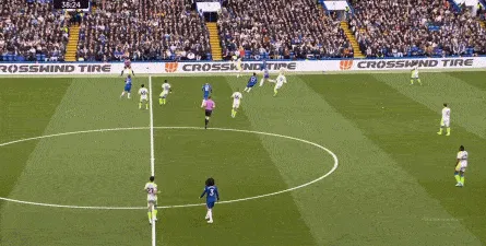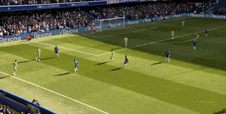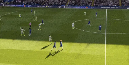 丢球了,切尔西在主场总该有些变化了吧,你不能说没有,这体现在他们的前场逼抢力度稍有提高,但并没有提高到足以干扰曼城后场球员起脚质量的高度,所以曼城反而打出了两次不错的打身后,这就把切尔西又给打回去了: